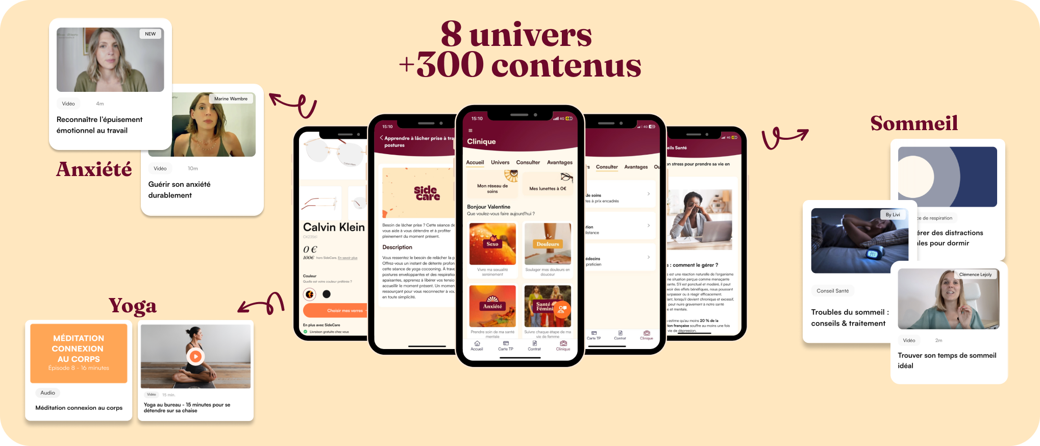 - La Clinique Digitale : plus de 300 contenus (vidéos, exercices, articles) disponibles 24/7, dans 8 univers clés (yoga, nutrition, sommeil, anxiété, douleurs, santé féminine, prévention, bien-être). C’est un véritable coach santé au quotidien, qui aide à rester en forme et à réduire le recours aux soins lourds.