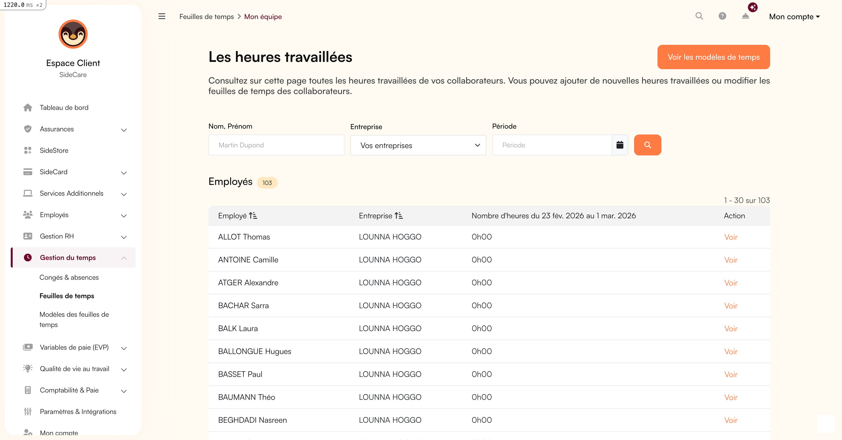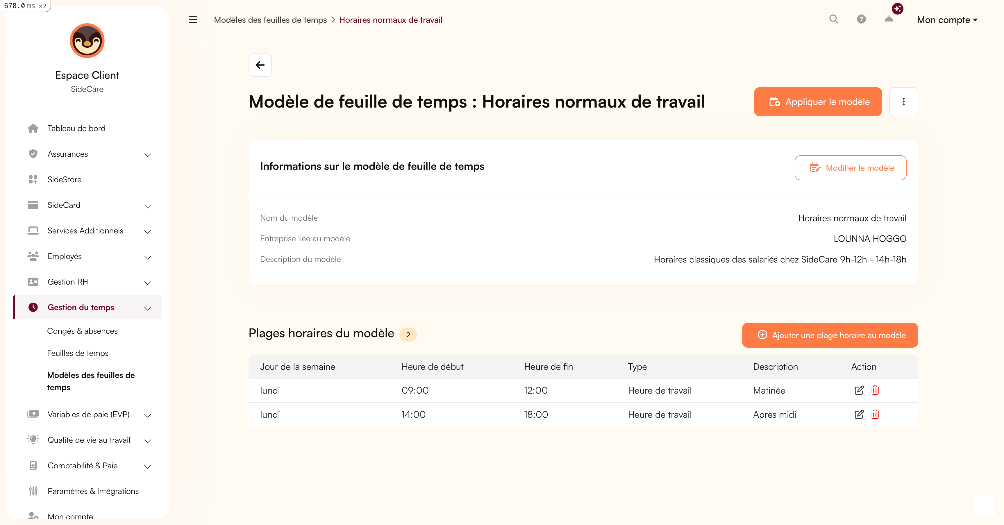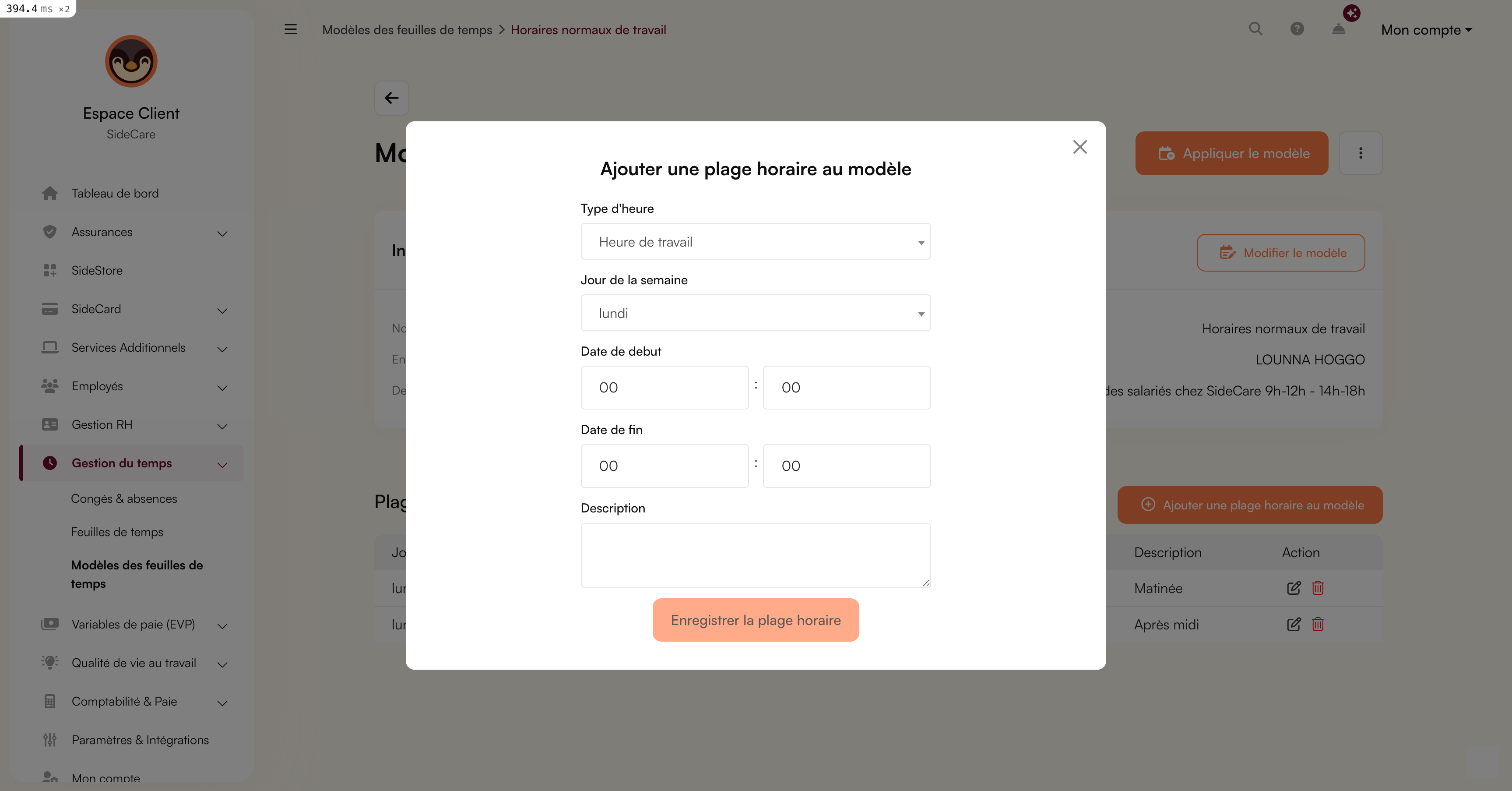 Vous pouvez paramétrer sur SideCare autant de modèles de temps que vous le souhaitez ! Cela vous permet de facilement dupliquer des semaines "type" pour un employé. Vous avez nativement accès à des fonctions de duplication faciles.